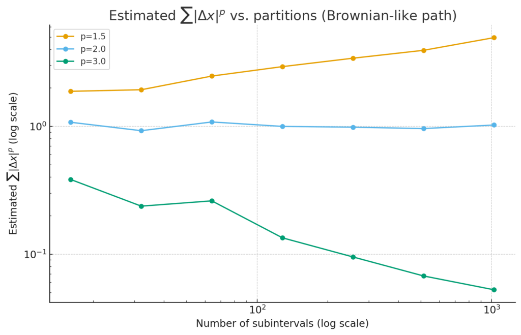 p=1.5 grows with refinement → too rough: p-variation “blows up” for