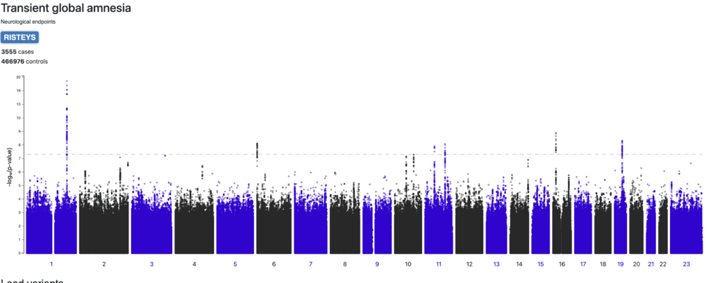 I shared with Mark Daly about this experience and he mentioned that there was a peculiar phenotype, transient global amnesia, in FinnGen, the population biobank of the Finnish population, that has stunning genome-wide association results. For one the associations seem to be specific to the phenotype and were not shared by other phenotypes, and two the phenotype had many towers, i.e. evidence of genetic variants associated to the phenotype.